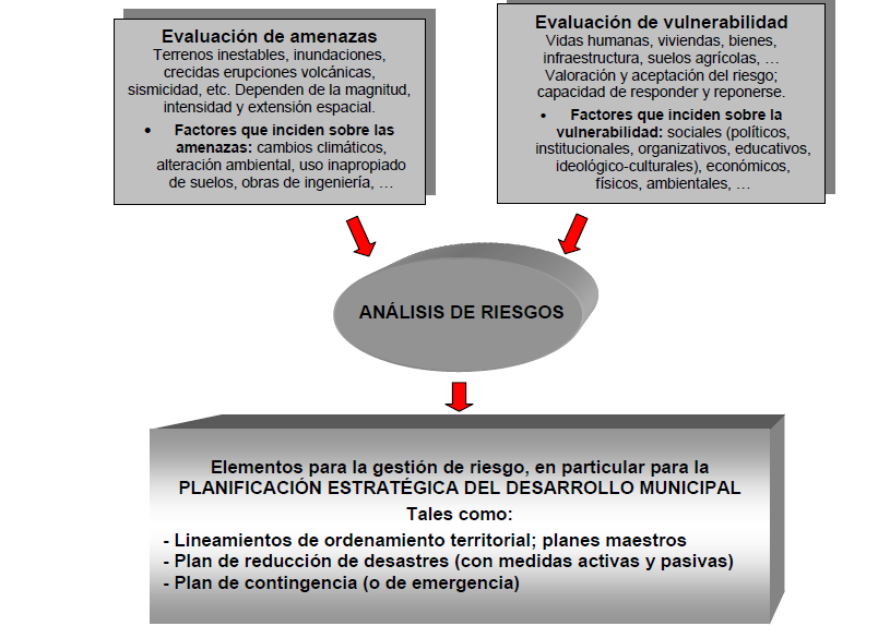 Las medidas de prevención1 incluyen la realización de estudios y análisis para identificar, evaluar y cuantificar el nivel de amenaza, vulnerabilidad y riesgo, así como las acciones para mitigar (reducir) los efectos de los peligros observados. Los estudios y análisis de identificación y evaluación de amenazas y vulnerabilidades están englobados en el denominado análisis de riesgos. El análisis de riesgos tiene como objetivo servir como base para la elaboración de los planes de reducción de desastres, y más allá de los planes de desarrollo municipal.