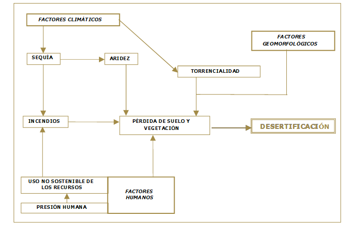 El desarrollo actual de los procesos de desertificación en España es consecuencia de una combinación de factores naturales y humanos, presentándose a continuación una breve síntesis de dichos factores y de los procesos que desencadenan, como punto de partida