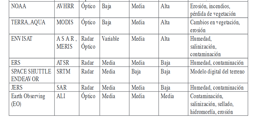 resolución espacial, temporal, espectral y radiométrica de cada sensor. Así, los sistemas con alta resolución temporal (Modis, NOAA, Ikonos, Quick bird, Oberview, etc.) permiten hacer un seguimiento continuado de los distintos procesos que afectan al suelo: erosión, áreas afectadas por incendios, deforestación, regeneración de la vegetación, etc. lo que facilita el rápido desarrollo de planes de actuación que minimicen el impacto en el suelo. Estos sistemas suelen tener una baja resolución espacial, por lo que se emplean para estudio a escala regional o global.